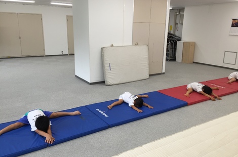 マンションの集会所なので施設的な制約はありますが、指導は大阪体操クラブのベテランスタッフが担当しておりますので、逆立ちや逆上がりは当然ながら、バク転や蹴上がりまで指導します。